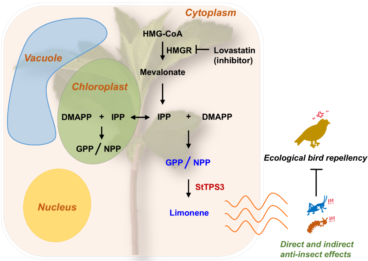 This work revealed limonene, α-phellandrene, and p-cymene as the dominant volatile monoterpenes in S. trilobata. Together they represent more than 80% of total emissions and show strong anti-insect activity, especially against species that serve as major bird prey. Enzyme assays revealed that StTPS3, a cytosolic terpene synthase, can use both GPP and NPP to produce limonene. Inhibiting the mevalonate (MVA) pathway sharply reduced monoterpene release, suggesting the possible presence of a cytosolic monoterpene biosynthetic route.