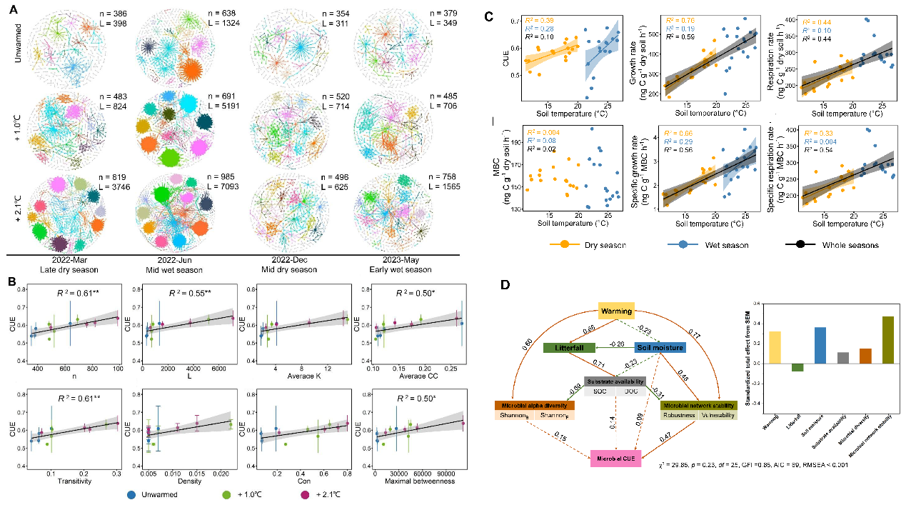 The team found that under long-term warming, soil microbial communities undergo fundamental reorganization, forming more stable networks that use carbon more efficiently, thereby reducing carbon emissions to the atmosphere.