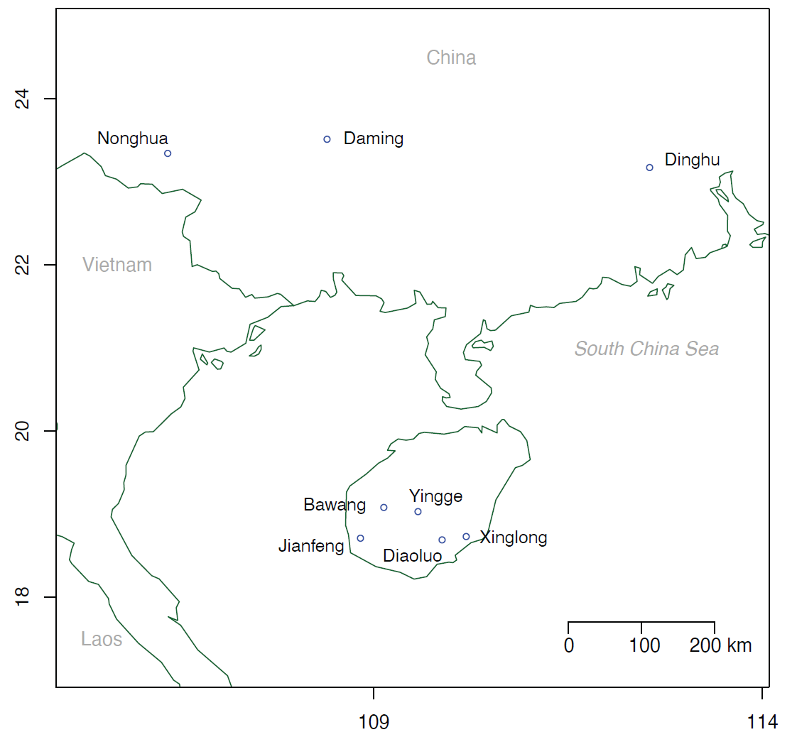 Figure 1. Map of southern China indicating the eight sites where this study was conducted. (Image by HAO et al.)