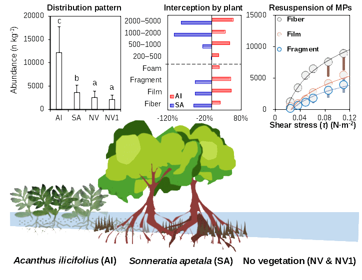 In intertidal zones, mangrove ecosystems, characterized by high biomass, can effectively reduce tidal current velocity, facilitating MPs deposition and thus serving as important "sinks" for MPs. Nevertheless, intense hydrological disturbances caused by extreme meteorological events (such as typhoons and storm surges) may trigger the resuspension of sedimentary MPs into the water column, converting mangroves into "source". Existing studies have mostly focused on the horizontal distribution characteristics of MPs in mangrove sediments, while key information such as vertical distribution patterns, interception efficiency, and hydrodynamic critical conditions for MPs resuspension with its selective characteristics remains insufficiently understood. The mechanism underlying the “source-sink” conversion of MPs remains unclear.