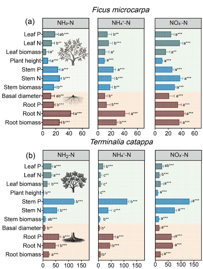 Figure 1. Growth and nutrient responses of different organs in Ficus microcarpa and Terminalia catappa to various nitrogen forms.(Image by WANG et al.)