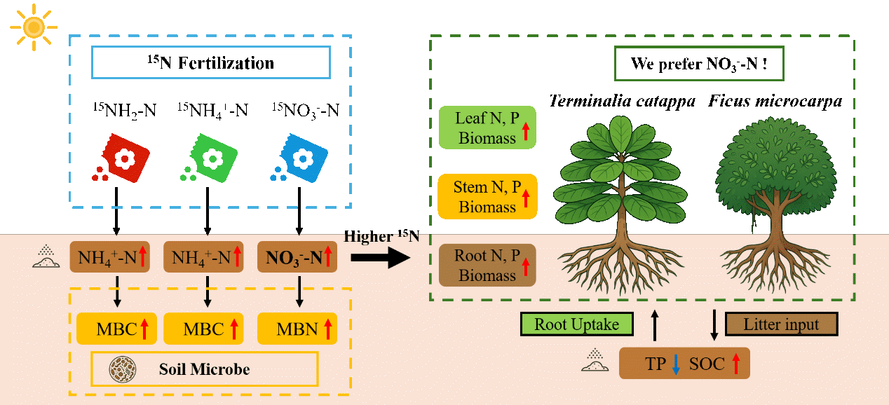 Tropical coral island soils suffer from high alkalinity and poor nutrient holding capacity, making nitrogen a critically limiting factor for plant life. While traditional restoration efforts often involve heavy fertilizer use, this approach risks severe nitrogen loss and environmental damage. Recently, a team from the Xiaoliang Research Station of the South China Botanical Garden utilized 15N isotope tracing to find a better solution. By testing ammonium, nitrate, and amide nitrogen on two resilient local species (Ficus microcarpa and Terminalia catappa) grown in coral sand, the researchers systematically assessed how different nitrogen forms impact plant development and the soil's ability to retain vital nutrients.