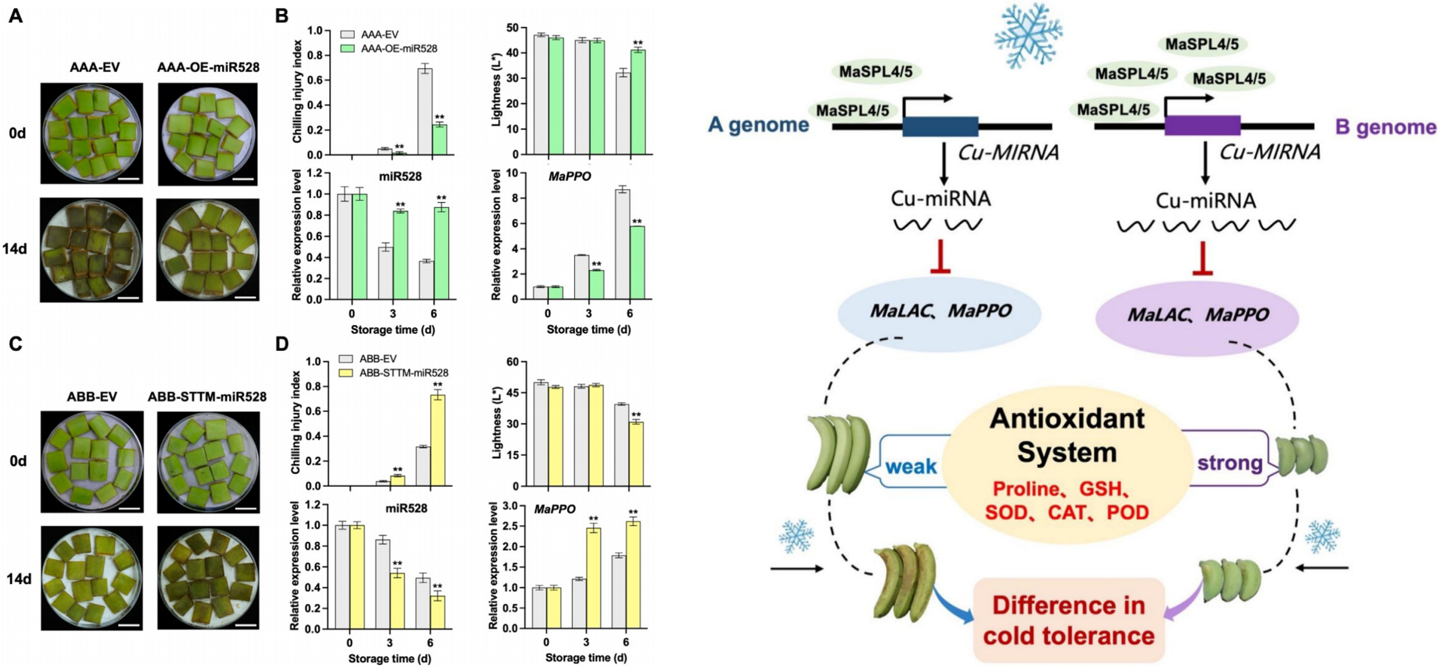 This study explored the molecular mechanism by which Cu-miRNA regulates the difference in cold tolerance between AAA type (Cavendish) and ABB type (Pisang Awak) banana fruits. The researchers revealed that there is a significant correlation between fruit antioxidant capacity and Cu-miRNA accumulation, and Cu-miRNAs participate in the regulation of redox homeostasis by targeting multiple copper-containing redox enzymes. Further research revealed that the expression levels of upstream transcription factors MaSPL4/5 and their transcriptional regulatory intensities on Cu-MIRNA genes vary, which may be the key factors leading to the differential accumulation of Cu-miRNA in the two types of banana fruits, i.e., higher Cu-miRNA accumulation in cold-tolerant ABB type banana, which is related to higher expression levels of MaSPL4/5 and stronger activation of MaSPL4/5 on Cu-MIRNA promoter of the B genome. Subsequently, transient overexpression of miR528 (OE-miR528) in cold-tolerant AAA type banana peel could alleviate chilling injury, while transient silencing of miR528 (STTM-miR528) in the cold-tolerant ABB type banana peel could aggravate chilling injury.